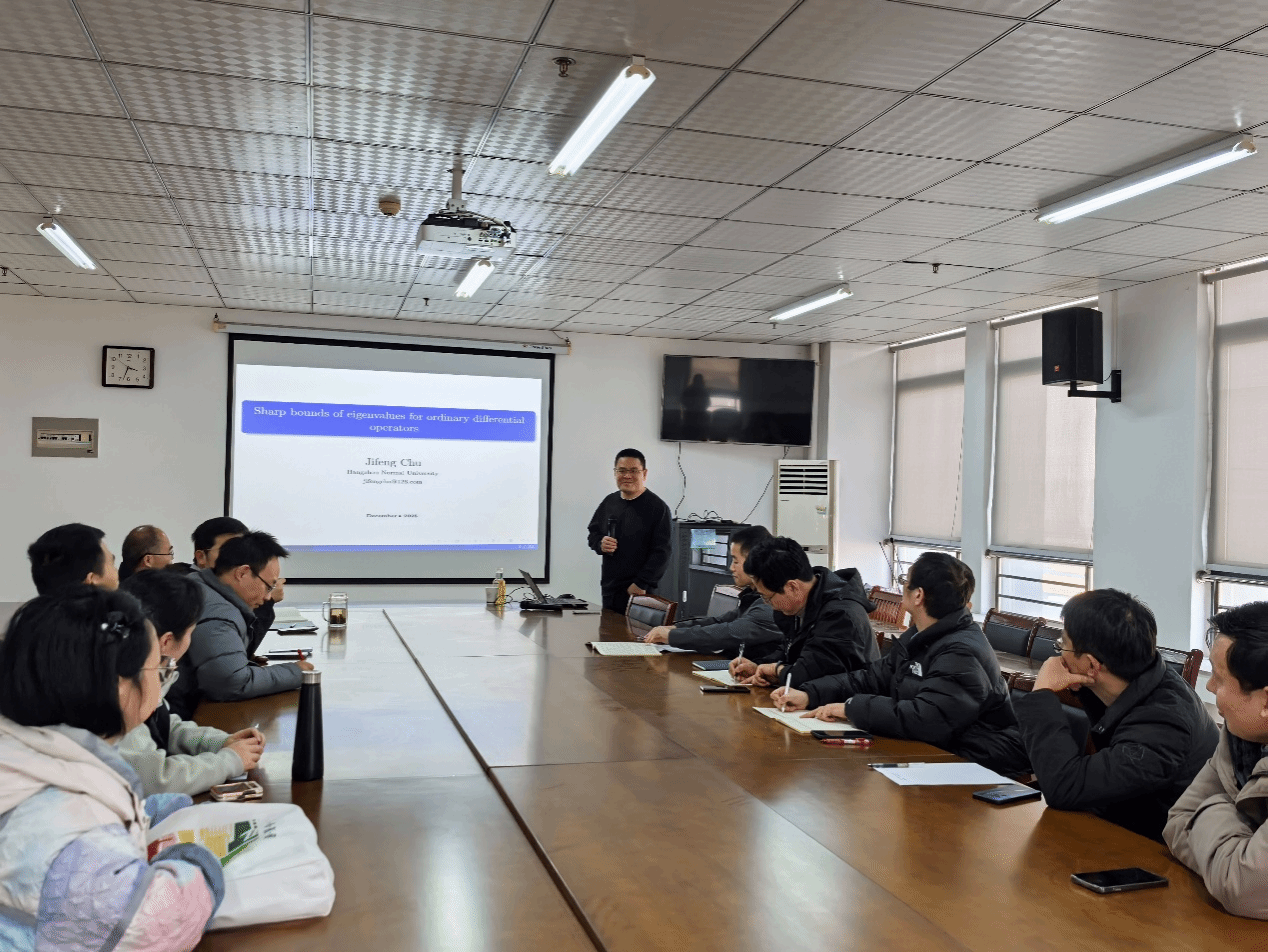 2025年12月8日下午,数学与统计学院在行知楼1102会议室举办微分方程与动力系统学术报告会。杭州师范大学储继峰教授应邀作题为“常微分算子特征值界的锐化性”的学术报告。报告会由数学与统计学院院长杨刘教授主持,学院微分方程与动力系统研究方向的教师参加了本次学术活动。