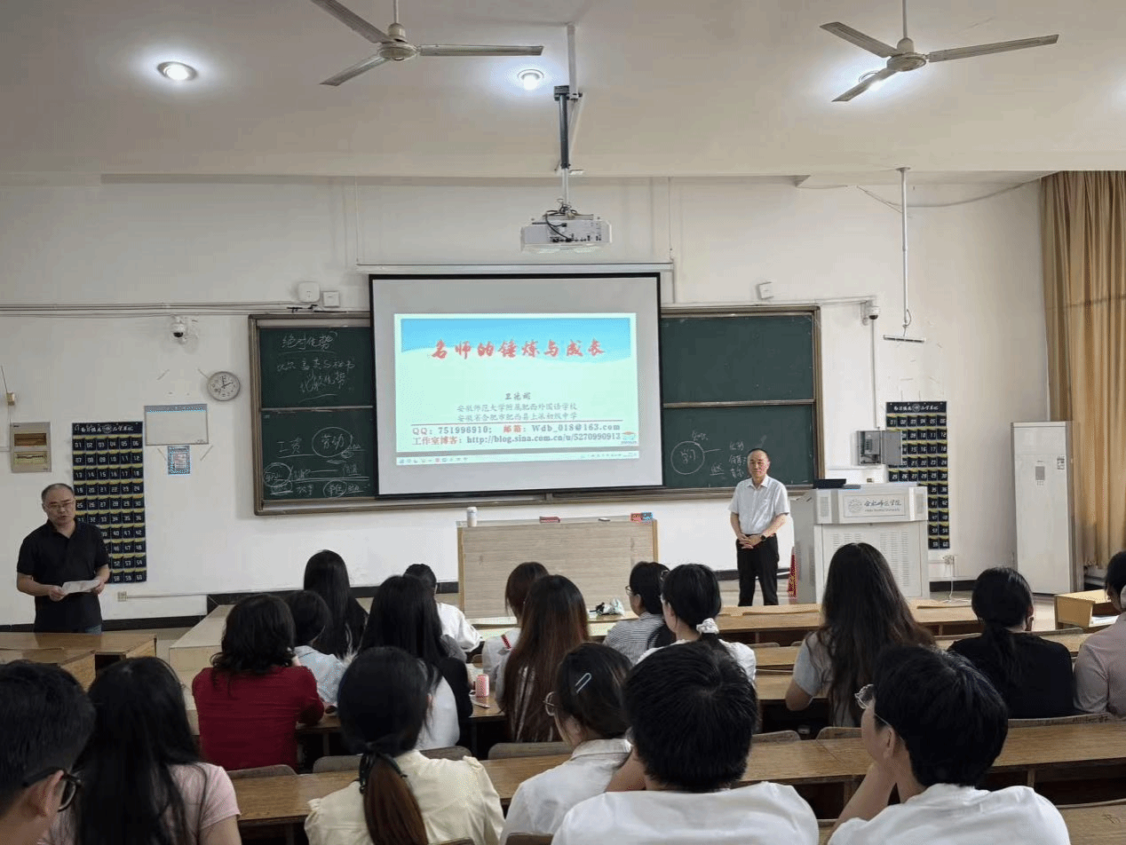 为帮助学生明晰名师成长路径,夯实专业发展基础,9 月 26 日,数学与统计学院邀请学院优秀校友、正高二级教师、国家“万人计划”教学名师、安徽师范大学附属肥西外国语学校数学老师卫德彬在锦绣校区博约楼 108 教室,举办“名师的锤炼与成长”主题讲座。2025级学科教学(数学)全体学生参与讲座,讲座由数学与统计学院院长杨刘主持。